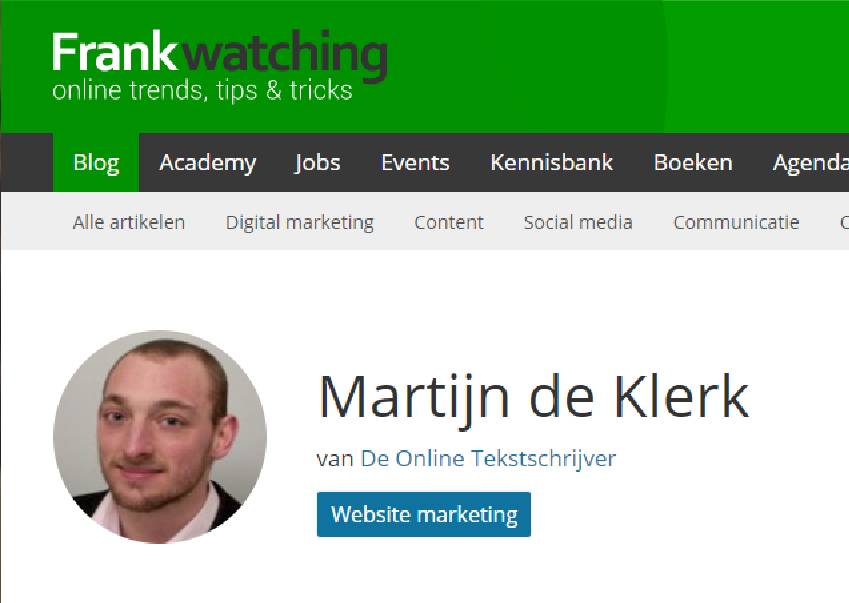 Ik ben gastblogger op de site van Frankwtching, waar ik schrijf over de trends in copywriting en SEO. Mijn blog Trends online marketing in 2012 was het best gelezen artikel. Ook voor andere blogsites zoals DutchCowboys en KGOM heb ik geschreven en ik won de Karel Geenen conversietest.